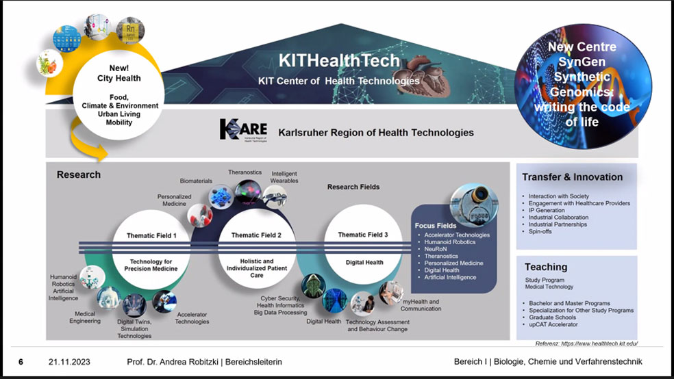 Dafür wird das neue KIT-Zentrum für Gesundheitstechnologien (KITHealthTech) zukünftig Antworten liefern, betonte Prof. Andrea Robitzki, Leiterin des Bereichs 1 – Biologie, Chemie und Verfahrenstechnik am KIT. Sie ist eine der Initiatorinnen des neugeschaffenen Zentrums und begrüßte die Teilnehmenden des Thementags „Gesundheitswesen im Wandel“ am 21. November 2023. Im KITHealthTech sei die Forschung ein kontinuierlicher Strategieprozess, um die Zukunft der Gesundheitstechnologien mitzugestalten, insbesondere in den Feldern Präzisionsmedizin, personalisierte Medizin und digitale Gesundheitslösungen. Anhand von mehreren Beispielen gaben die wissenschaftlichen Gäste des Zentrums einen Einblick in die Schlüsselaspekte ihrer Forschung.