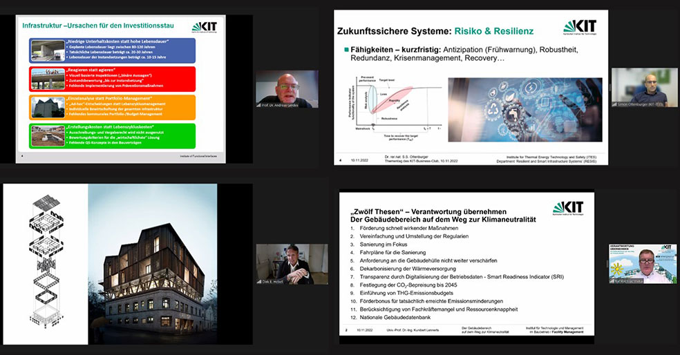 Der KIT-Business-Club bedankt sich für diesen tollen Thementag, für interessante Vorträge, spannende Diskussionen und offene Gespräche bei den Gästen und Vortragenden: Prof. Andreas Gerdes, Institut für Funktionelle Grenzflächen | Dr. Sadeeb Simon Ottenburger, Institut für Thermische Energietechnik und Sicherheit | Prof. Kunibert Lennerts, Institut für Technologiemanagement im Bauwesen | Prof. Dirk Hebel, Institut für Entwerfen und Bautechnik | Dr. Rebekka Volk,Institut für Industriebetriebslehre und Industrielle Produktion.