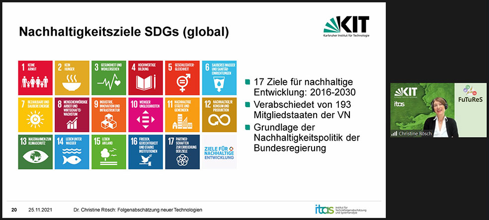 Angesichts vieler unterschiedlicher Felder und Aspekte ist Nachhaltigkeit schwer zu greifen und zu bewerten. Auf globaler Ebene haben die Vereinten Nationen deshalb in den letzten Jahren mit den 17 ‚Sustainable Development Goals‘ einen umfassenden Handlungsrahmen definiert: „Aus den dort formulierten Zielgrößen lässt sich für Staat und Gesellschaft ein Set an Indikatoren ableiten, um den Fortschritt bei der Erreichung der Ziele zu messen und zu bewerten“, wie Dr. Christiane Rösch vom Institut für Technikfolgenabschätzung und Systemanalyse (ITAS) im ersten Vortrag erläuterte. Analog werden auch bei vielen Unternehmen Strategien erarbeitet, die die Kriterien aus unterschiedlichen Handlungsfeldern aufgreifen und den Weg zu einer nachhaltigen Entwicklung fördern.