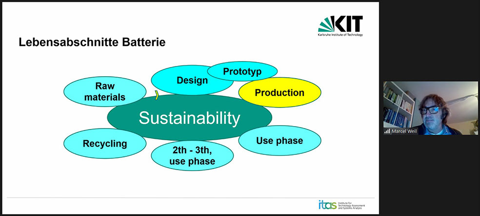 - Die aktuelle Entwicklung im Bereich der Batteriesysteme für unterschiedlichste Anwendungen ist sehr dynamisch. Umso wichtiger ist eine umfassende Nachhaltigkeitsbetrachtung dafür. Die Arbeiten zur ‚Life Cycle Analysis‘ von Dr. Marcel Weil aus dem Institut für Technikfolgenabschätzung und Systemanaysle (ITAS) liefern wertvolle Erkenntnisse zu kritischen und unkritischen Rohstoffen, sowie über die Nachhaltigkeit von verschiedenen Zell-Designs und Produktionswegen. Gleichzeitig zeigen sie auch, dass zur Nachhaltigkeit eines Batteriesystems vor allem auch ein passendes Nutzungsszenario und das Recycling eine große Rolle spielen.