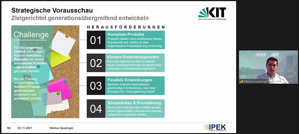 - Schon in der Produktentwicklung und beim Design liegen wichtige Stellschrauben, um zu nachhaltigeren Produkten zu kommen. Markus Spadinger vom Institut für Produktentwicklung (IPEK) erläutert: „Zur Optimierung muss stets das soziotechnische Gesamtsystem, also auch der potenzielle Nutzer und sein Umgang mit einem Produkt, einbezogen werden“. Der Methodenbaukasten der Produktentwicklung für nachhaltige, zukunftsfähige Lösungen umfasst u.a. Trendanalysen, Szenariotechniken oder ein Roadmapping für verschiedene Produktgenerationen.