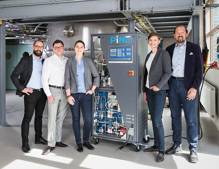 Forscher des Instituts für Meteorologie und Klimaforschung (IMK) des KIT wollen gemeinsam mit der Bilfinger Noell GmbH die Wolkenforschung professionalisieren. Mithilfe der mobilen Wolkenkammer PINE ermöglichen sie autarke, vollautomatische Langzeitmessungen von Aerosolen und Eiskeimpartikeln. Das Messgerät wird mittlerweile weltweit vertrieben.