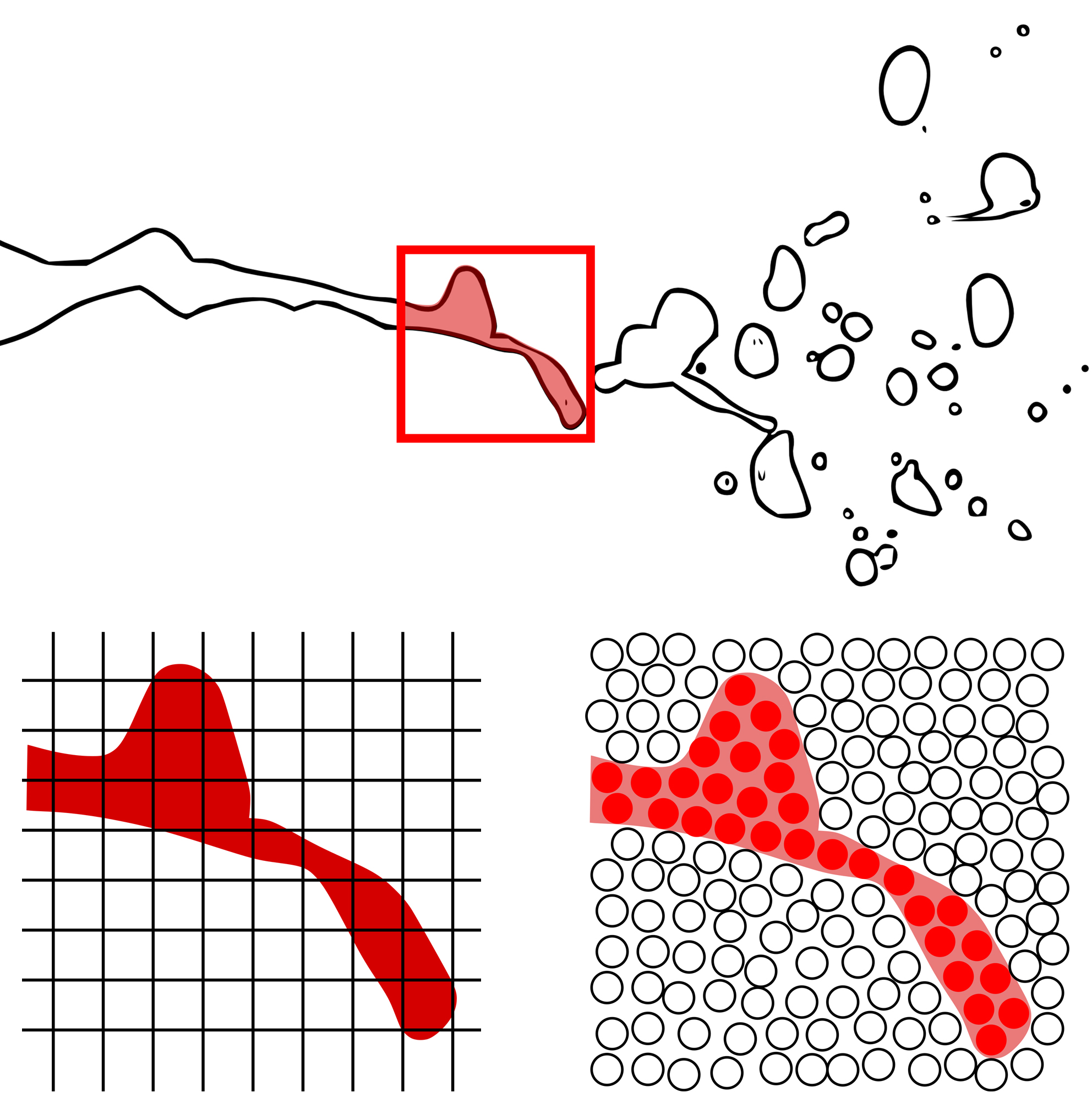 Computergestützte Simulationen solcher Strömungen unterstützen diese Entwicklungsarbeit erheblich. Gegenwärtig werden dazu vorwiegend gitterbasierte Simulationsverfahren eingesetzt, bei denen die Phasen – flüssige oder gasförmige Materialien – als Volumenanteile in Gitterstrukturen abgebildet werden. Bei komplexen Problemstellungen, wie beispielsweise der Kraftstoffeinspritzung, muss das Gitter mit Grenzfläche zwischen Flüssigkeit und Gas mitbewegt werden, wodurch eine enorme Rechenleistung nötig ist. Bei technisch relevanten Mehrphasenströmungen stößt diese Methodik an ihre Grenzen.