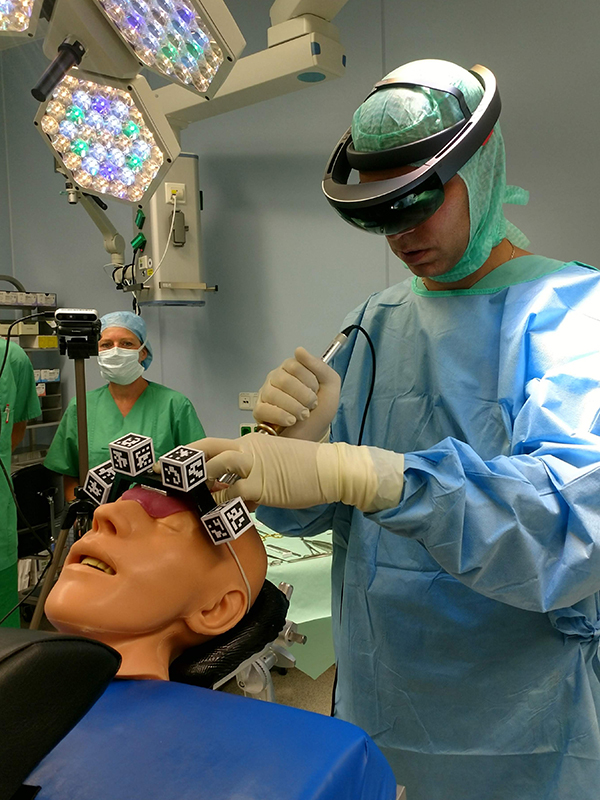 Am Institut für Anthropomatik und Robotik (IAR) des KIT wurde ein System entwickelt, um Informationen aus CT-Bildern so aufzubereiten, dass sie mittels Datenbrille auf den Kopf der operierten Person projiziert werden können. Die Informationen im Sichtfeld unterstützen die Operierenden so bei der Bestimmung von Einstichstelle und -winkel. Dazu werden bestehende CT-Bilder mittels konventioneller Bildverarbeitung in 3D-Modelle umgewandelt. In wenigen Sekunden ist das individuelle Modell errechnet. Durch die Überlagerung des individuellen Patientenmodells mit dem statistischen Mittel lassen sich die ideale Positionierung der Kocherpunkte zur Schädelöffnung einerseits und die relevanten Injektionspunkte andererseits sichtbar machen. Mit einer Datenbrille werden diese Punkte dreidimensional auf dem Schädel visualisiert und geben Orientierung im Sichtfeld der Operierenden.