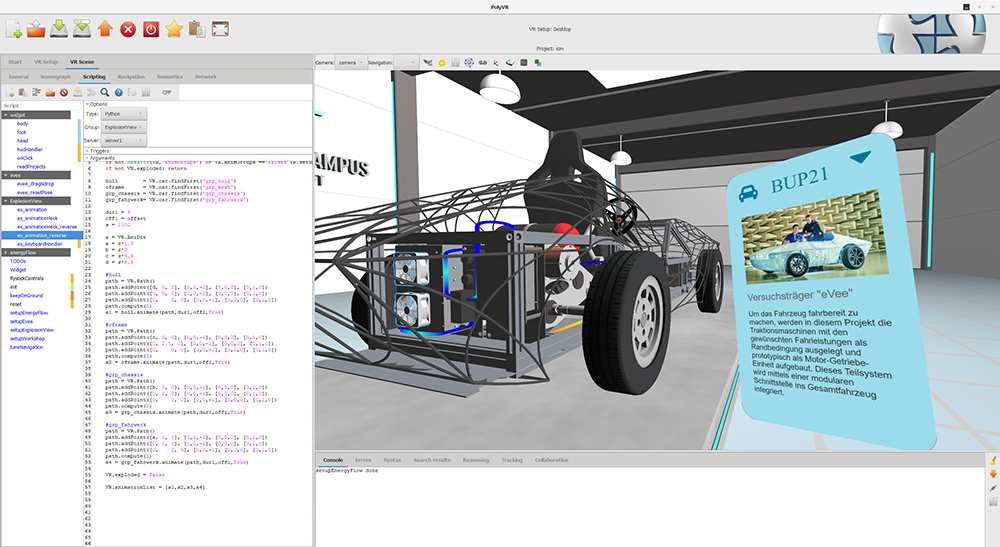 Das am Institut für Informationsmanagement im Ingenieurwesen (IMI) des KIT entwickelte VR-Autorensystem „PolyVR“ adressiert diese Herausforderung mit einer skalierbaren VE-Lösung. Über die Benutzeroberfläche können Datenformate wie Numerik-, Netz-, Volumen- oder CAD-Daten komfortabel importiert und eine sogenannte virtuelle Szene generiert werden. Der Authoring-Prozess ist dabei dynamisch und jede Änderung virtuell sofort sichtbar: Daten können in der laufenden Szene verwaltet, verändert und erweitert werden, ohne diese anhalten oder neustarten zu müssen. Die Software basiert auf Open-Source-Bibliotheken und unterstützt alle gängigen Standards für den Datenaustausch.