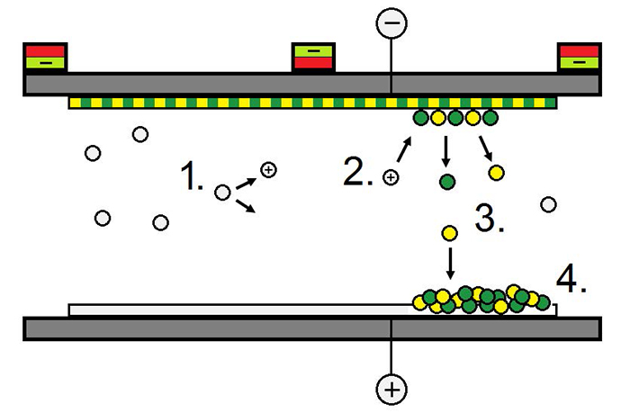 Forschenden des KIT ist es gelungen, mittels Spark-Plasma-Sintern auf Kupferscheiben ein Sputter-Target mit atomar homogener Verteilung herzustellen. Grundlage bildet Pulver der intermetallischen Verbindung aus Gallium und Palladium. Dieses intermetallische Sputter-Target bildet die Basis für die Synthese der Schicht via DC Magnetron Sputtern. Mit diesem bekannten Verfahren lassen sich durch die Verwendung der neuartigen Sputter-Targets einphasige intermetallische Schichten mit einer Stärke von wenigen Nanometern bis zu ca. einem Mikrometer herstellen. Durch vorherige Maskierung der zu beschichtenden Oberfläche lassen sich die intermetallischen Verbindungen in festgelegten Formen aufbringen. Durch diese Strukturierung der Schichten kann die katalytische Aktivität modifiziert werden.