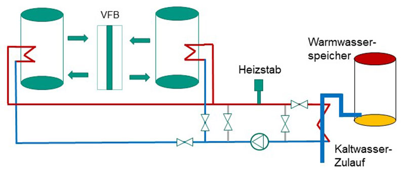 Am Batterietechnikum des KIT wurde ein neuartiges Wärmetransportsystem entwickelt, das für VFB den Nachteil der geringen Energieeffizienz und Energiedichte minimiert und somit die Profitabilität steigert. Dieses sogenannte thermische Koppelmodul (TKM) nutzt Abwärme, die bisher ungenutzt mittels Kühlgeräten in die Umwelt gelangt, für die Wärmerückgewinnung. Die Abwärme entsteht im Elektrolyten der VFB und sammelt sich in den beiden Tanks. Je ein Wärmetauscher ist in den Elektrolyten eingelassen, um die Wärme dort einfach und effizient abzugreifen. Die Wärmeenergie wird im geschlossenen System der Gebäudetechnik dann zum Beheizen des Gebäudes oder die Warmwasseraufbereitung genutzt. Es ist zu erwarten, dass dadurch die Gesamteffizienz auf rund 85 Prozent steigt. Neben der ursprünglichen Nutzung der VFB als elektrischer Speicher fungiert sie durch das TKM zusätzlich als Wärmespeicher. Dazu wird Wärme mittels Heizelement in den Speicher eingebracht. Dieser Zusatznutzen erhöht die Eigenverbrauchsquote des Gebäudes, was zu einer Kostenersparnis führt.