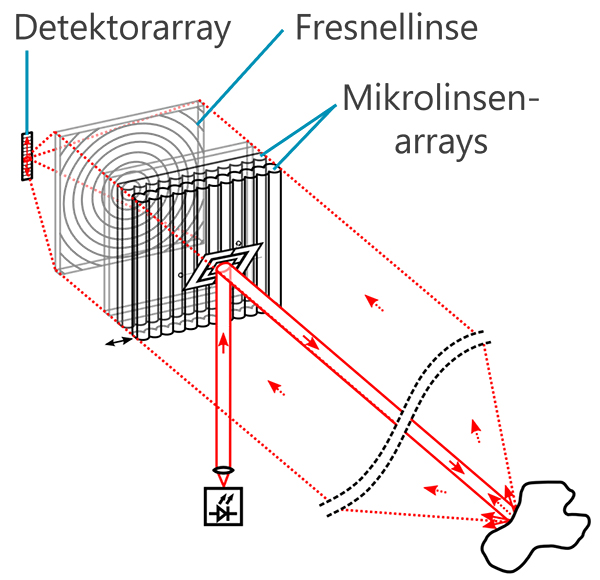 Dabei lässt sich der Verschiebevektor so verändern, dass das System passend für Empfangsstrahlen in bestimmten Winkeln eingestellt werden kann. Diese Empfangsstrahlen können dann punktgenau auf einen kosteneffizienten Detektor mit kleiner Fläche fokussiert werden. Das Linsenraster ist als Kunststoff-Spritzgussteil ein günstiges Bauteil. In Verbindung mit piezo-elektrischen Aktoren lässt sich so ein sehr leichtes, aber steifes System realisieren, das unempfindlich gegenüber Vibrationen ist und zuverlässig auch große Distanzen vermisst.