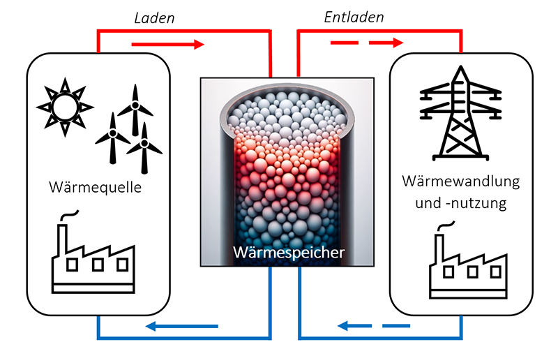 Viele Industriezweige, wie die Chemie-, Stahl- oder Zementindustrie, benötigen Hochtemperatur-Prozesswärme von 500 bis weiter über 1000 Grad Celsius. Bisher werden diese Temperaturen meist durch fossile Energiequellen erzeugt. Die Bereitstellung von Wärme nach Bedarf durch die Nutzung von Strom aus erneuerbaren Energiequellen in Kombination mit Wärmespeichern bietet jedoch Chancen zur nachhaltigen Industriewärmeerzeugung. Gleichzeitig kann die Nutzung und Speicherung von Abwärme integriert werden.
