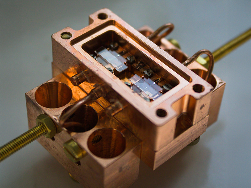 Das Institut für Quanten-Materialien und Technologien (IQMT) des KIT arbeitet an Lösungen, die diese Probleme adressieren. Ein spezielles Chipdesign verbindet Qubits, Ausleser und Koppler auf ganz neue Weise auf einem Kupferträger, wodurch Platzbedarf und Komplexität reduziert werden. Qubit und Auslesefunktion sind in einer Struktur vereint, sodass Qubit-Zustände ohne zusätzlichen Ausleseresonator erfasst werden. Dies gelingt mithilfe einer exakt symmetrischen Kapazitätsmatrix: Eine Aluminiumschicht wird in der Basis der Normalmoden des Schaltkreises aufgebracht, die eine rein induktive Kopplung zwischen Qubit-Schaltkreis und Ausleseschaltkreis ermöglicht. Diese Ausführung gewährleistet präzises Koppeln, wodurch sich Crosstalk minimiert und Signalqualität verbessert. Die Forschenden machen sich die Stückelberg-Interferenz zunutze, um den Koppler mit einer wählbaren Frequenz (Frequenzmultiplexing) anzusteuern. Dieses physikalische Phänomen erlaubt es, Steuerfrequenzen eines Kopplers dynamisch anzupassen.