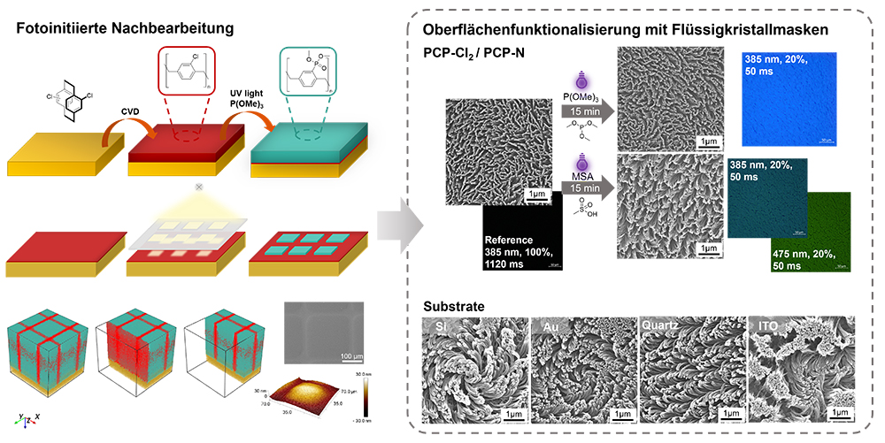 Forschenden des Instituts für Funktionelle Grenzflächen (IFG) am KIT ist es nun gelungen, die industriell bereits weitverbreiteten Parylene-C-Beschichtungen (basierend auf Paracyclophan) mithilfe eines photochemischen Mechanismus mit völlig neuen funktionellen Gruppen auszustatten. Die chemische, lösungsmittelfreie Transformation erfolgt dabei katalysiert durch UV-Licht, wobei keine zusätzlichen Katalysatoren, Basen oder andere Redoxsysteme und keine hohen Temperaturen nötig sind. Die so erstmals erzeugten phosphonathaltigen Parylene ermöglichen einfache Beschichtungen bis hin zu gezielt mikrofeinen Netzwerk- oder Faserstrukturen. Alle aufgebauten Strukturen zeichnen sich durch hohe thermische und oxidative Stabilität aus.
