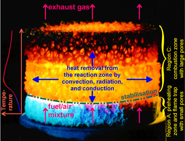 Projektleiter Weis vom KIT erklärt: „In der technischen Entwicklung ging es darum, den Zulauf des Brenners auf ein anderes Medium umzustellen. Die Schwierigkeit dabei war, beim Funktionsprinzip des Porenbrenners den unterschiedlichen verbrennungstechnischen und physikalischen Eigenschaften von Erdgas und Wasserstoff gerecht zu werden. Wenn ich Wasserstoff anstatt Erdgas benutze, hat das natürlich unmittelbar Einfluss auf weitere Komponenten.“ Zusätzlich zur bestehenden Erdgaszufuhr im Zentrum des Brenners wurde eine separate Zufuhr für reinen Wasserstoff integriert. „Anders als Erdgas und Luft, die sich in einer Art Vormischzone verbinden und gemischt in die Verbrennungszone gelangen, wird Wasserstoff erst nahe der Verbrennungszone mit der Luft diffundiert. Die Herausforderung lag dabei in der gleichmäßigen Verteilung von Wasserstoff und der Mischung mit der Luft in diesem lokal begrenzten Bereich“, so Weis weiter. Die Forschenden vom EBI fanden die Lösung in einer mehrschichtigen Misch- und Verteileinheit aus einem metallischen Werkstoff, die zwischen Vormischzone und Keramik platziert ist.