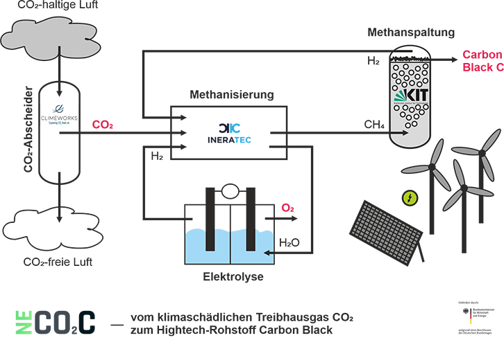 In the debate about climate change and the causes of global warming, emissions from the combustion of fossil fuels, such as in power plants or industrial production processes, are at the top of the list of polluters. Carbon dioxide (CO2) constitutes the lion's share of the so-called greenhouse effect. In order to slow down the associated climate changes and avert the resulting climate crisis, science and industry are already pulling out several stops: on the one hand, the avoidance and reduction of emissions, and on the other hand, the storage of carbon dioxide in the ground. At KIT, a globally unique approach is developed in the research project NECOC (NEgative CarbOn dioxide to Carbon): Extracting excess CO2 from the air and converting it into the raw material carbon black, also called industrial soot.