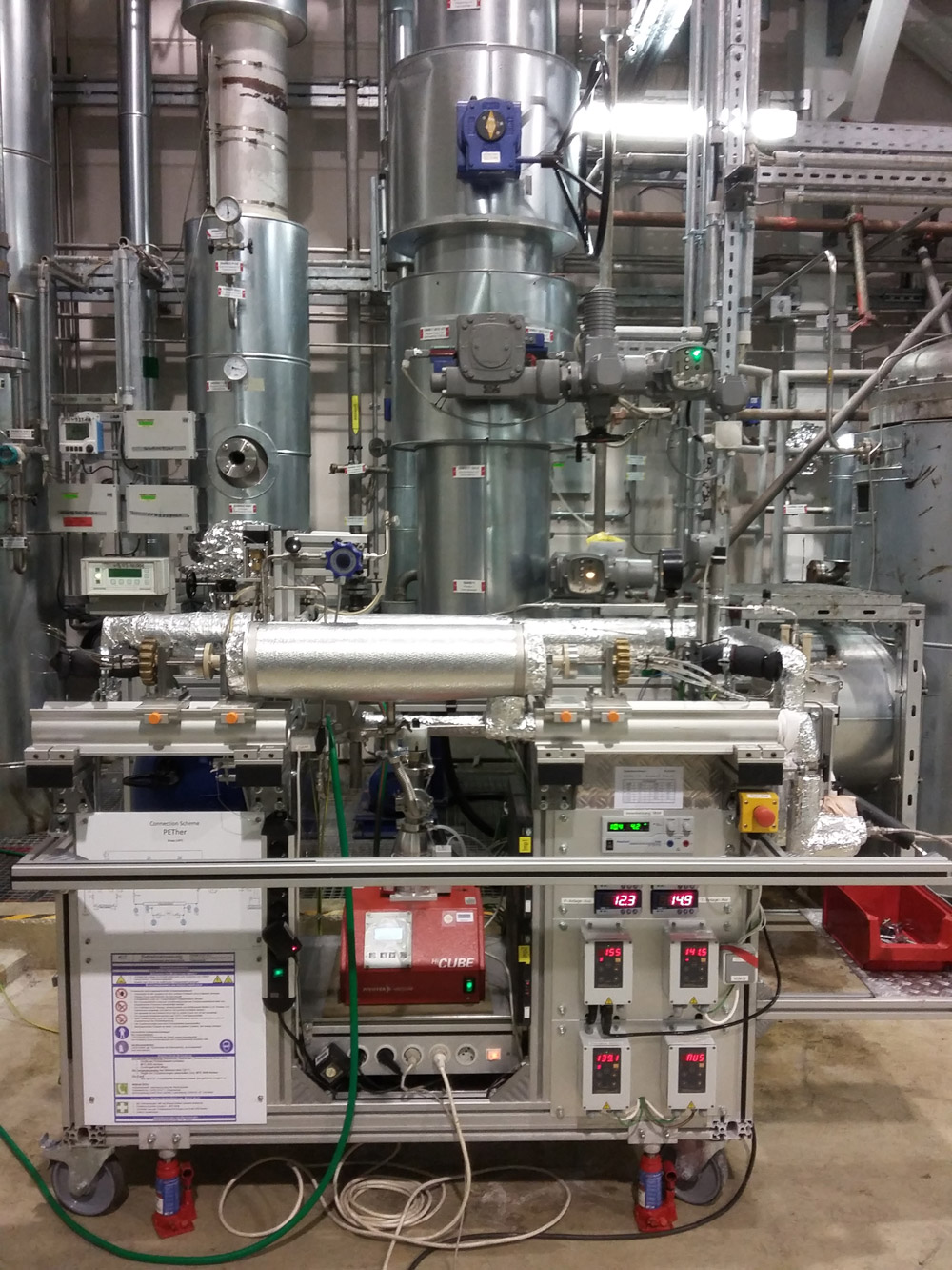 Scientists at the KIT Institute for Nuclear and Energy Technologies (IKET) have therefore developed a fluid calorimeter that can analyse thermal water of up to 170 degrees Celsius directly on site. Thus the water can also readily be checked when the geothermal plant is in operation, with the calorimeter being used as a mobile test stand that is directly linked to the power station network via a “bypass”. The thermal water is immediately fed from the plant into the flow tube of the calorimeter. Here, it flows past temperature probes at the tube entry and outlet as well as past an Ohm heater. Given a certain fluid mass flow, the heat capacity can be determined using the amount of heat contributed by the heater and the difference in temperature between the two probes. Here, the calorimeter ensures that pressure of up to 30 bar is maintained, and it also compensates heat losses.