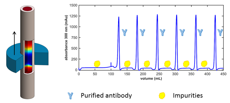 Scientists at the KIT Institute of Functional Interfaces (IFG) have developed an advanced separation process to remedy this. While it is based on the conventional chromatography principle, it avoids additional chemicals and achieves significantly better separating performance thanks to thermo-responsive sorption substances in combination with a wandering temperature control zone around the sorption pillar. A chamber with controlled temperature that encloses the column ensures optimum conditions. The dissolved mixture of substances is pumped continuously into the column, and the target substance is bonded to the sorption substance. During this process, a local increase or decrease in temperature is cyclically activated. This climate zone is pushed step by step in the flow direction, although at a speed lower than the flow speed itself. Desorption commences in the climate zone, which results in a concentration peak that leads to an increase in the adsorbed amount of the target substance outside the climate zone. As the zone approaches, this process is repeated, right down to the outlet of the fixed-bed column. The setting in several times of adsorption and desorption results in the formation of a sharply delineated concentration front that can be channelled off at the end of the column while substance is continuously pumped into the column at the inlet.