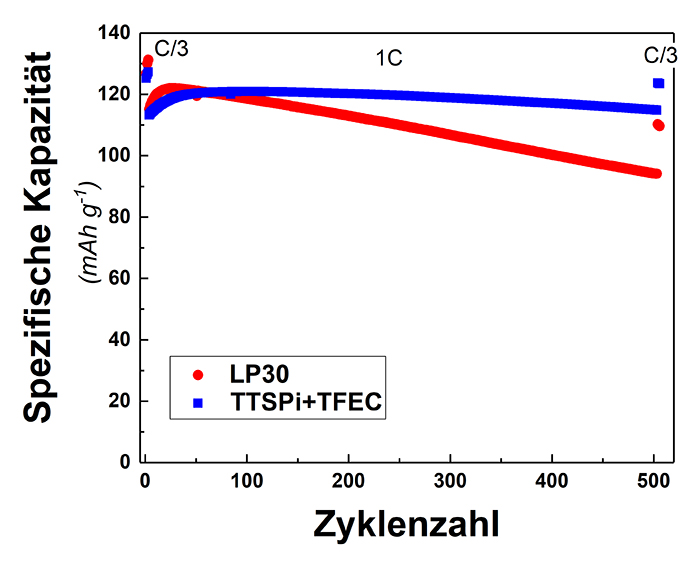 At the Helmholtz Institute Ulm (HIU) of KIT, scientists with a special electrolyte composition have succeeded in ensuring the necessary stability and at the same time increasing the efficiency of high-voltage batteries. In addition to the usual components of a liquid electrolyte, such as organic solvent and conductive lithium salt, the electrolyte is specifically enriched with two complementary additives: phosphite and carbonate. The addition of electrolyte additives improves the ionic conductor properties and stabilizes the cathode-electrolyte interface, thus preventing electrolyte degradation at the cathode surface.