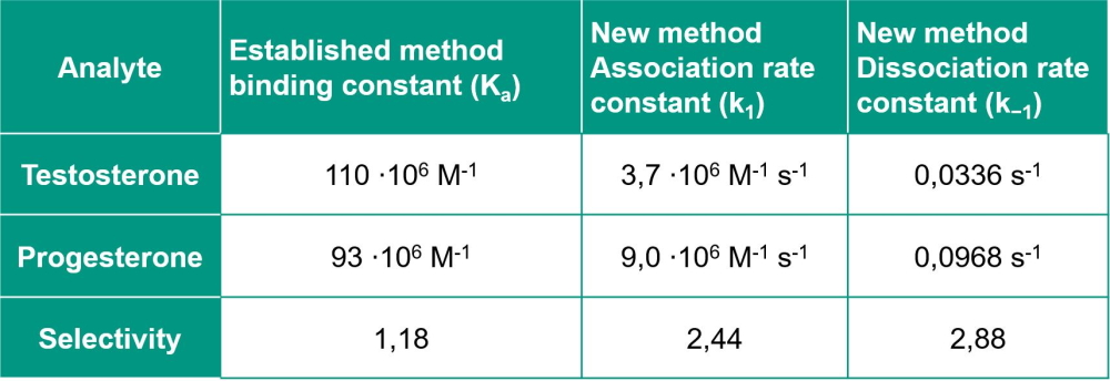 The advantage of the method lies in the improved and also accelerated possibility of analyte-differentiation based on their characteristic receptor binding kinetics. Therefore, instead of using costly, highly selective bioreceptors, it is now possible to employ known, chemically robust and inexpensive materials as receptor components, whose practical use has been hindered so far. However, the method can also be used to further improve the selectivity of bioreceptors, for which the differentiation of structurally similar analytes ("cross-reactivities") still poses a problem in some cases.