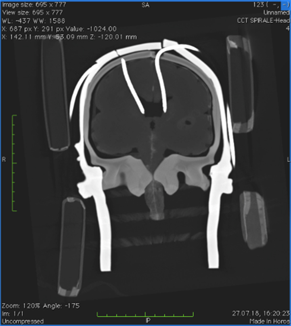 High pressure in the brain, e.g. due to brain hemorrhage or trauma, can lead to irreparable damage. To prevent these consequences, a surgical procedure is applied to puncture the ventricular system in the brain, thus reducing the pressure by removing fluid.