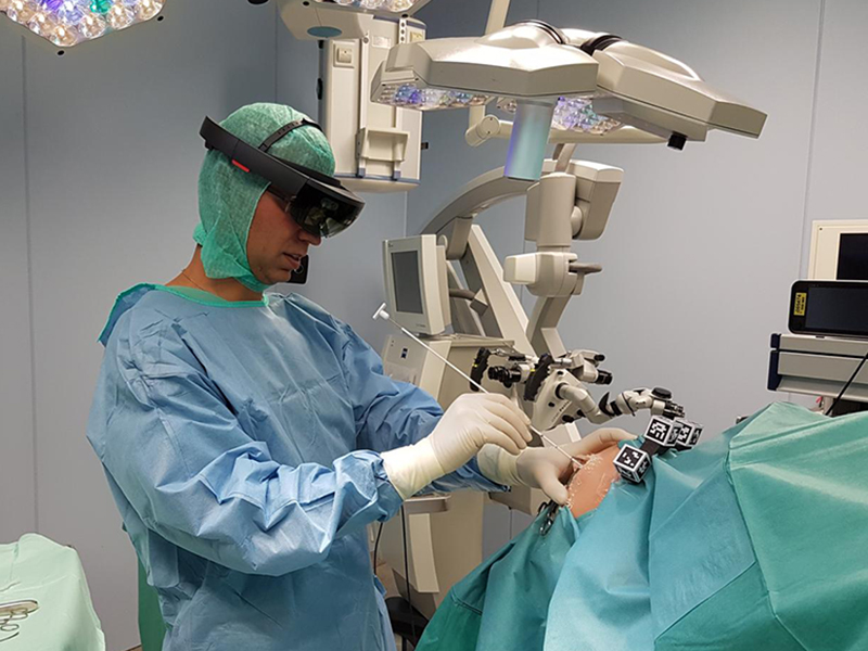 At the Institute of Anthropomatics and Robotics (IAR) of KIT, a system has been developed to process information from CT images in such way that it can be projected onto the head of the operated person using data glasses. The information in the field of view thus supports the surgeons in determining the puncture site and angle. For this purpose, existing CT images are converted into 3D models by conventional image processing. The individual model is computed in just a few seconds. By overlaying the individual patient model with the statistical average, the ideal positioning of the Kocher points in relation to the trepanation on the one hand and the relevant injection points on the other can be visualized. Using data glasses, these points are displayed three-dimensionally on the skull and provide orientation in the surgeon's field of view.