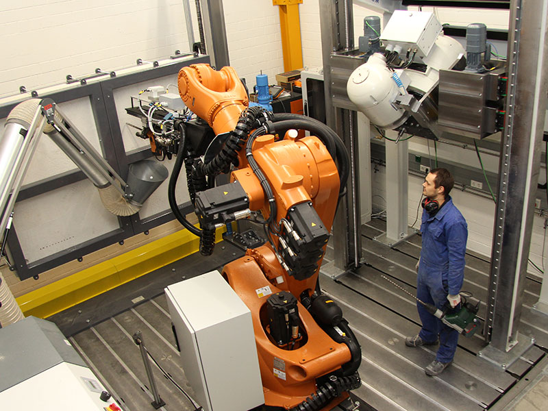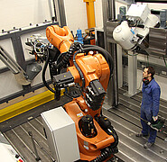A test facility at the IPEK Institute for Product Engineering of KIT addresses these challenges in research. At the test bench, an industrial robot takes on the role of the test person. The special aspect: The robot is effect equivalent to a human being. A mechanical hand-arm model reproduces the dynamics, compliance, attenuation and inertia that act on the tool via the human musculoskeletal system. Thus, in the test, the same loads arise for the tool under test as if a human would guide it. However, different users and usage situations can be simulated in a targeted manner. The robot is fed with measurement data from a wide variety of people, which are scientifically investigated in advance with the aid of manual tests and a shaker system.