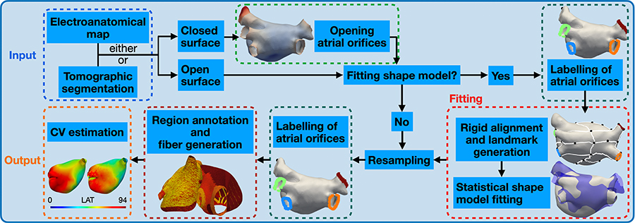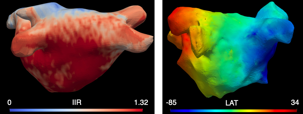 In order to find out patient-specifically which tissue has to be scarred and how, researchers of the KIT Institute of Biomedical Engineering (IBT) have developed a method to test the treatment on personalized heart models. Both magnetic resonance imaging data and electroanatomical measurements are used to create the individual digital heart models. Image processing is used to convert the data into a three-dimensional model, taking into account a reference model, and enrich it with general as well as patient-specific information. For example, pulmonary veins are identified. Individual information is, for example, the strength of cardiac contraction or the speed of propagation of electrical excitation. The anatomical landmarks that divide the heart into specific areas are automatically placed in the model using image recognition and enable more precise treatment. Various strategies can be tested on the model to find out simulatively whether the cardiac arrhythmia can still be triggered. If not, a promising ablation site has been found.