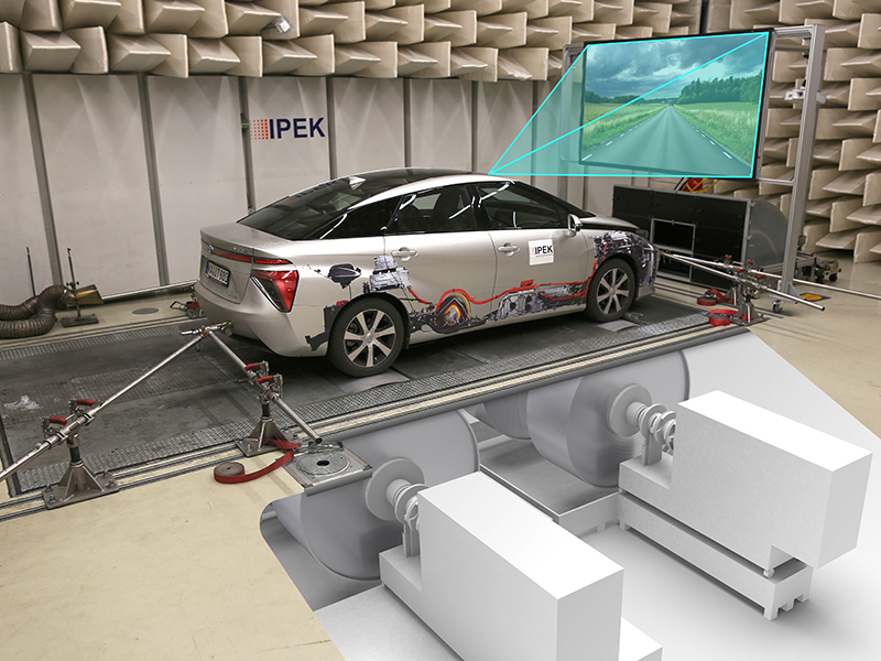 The roller test bench for 2-axle vehicles with a wheelbase of up to 3.40 meters at the IPEK – Institute for Product Development at KIT offers a unique, modular platform for investigating automated driving functions and networked mobility solutions. In a high-fidelity environment simulation based on the Vehicle-in-the-Loop approach, these are tested on the test bench in a reproducible manner and independently of external influences. With the help of sensor stimulation, complex scenarios can be implemented on the test bench, while driving dynamics, noise generation and interactions with the environment are precisely recorded using state-of-the-art measurement technology. Different use cases can be realized by driving with automated steering, seat box or driving robot. Driving tests with steering forces are completely new and the researchers are currently working on their realization.