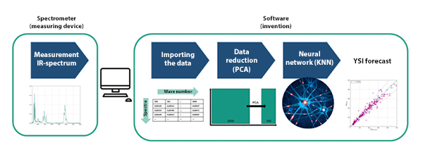 Researchers at KIT’s Engler-Bunte Institute have succeeded in developing an AI-based model that predicts the YSI directly from infrared spectra of fuel samples using a Kohonen Neural Network (KNN). Only a few drops are needed for measurement. The principle is simple: a Fourier-Transform Infrared (FTIR) spectrometer provides a characteristic spectrum for each sample – a kind of "fingerprint" of the fuel. Then AI comes into play: the KNN, trained with over 300 mixtures and pure substances from various substance groups (n/iso-paraffins, naphthenes, and aromatics), forms the core of the process. The intelligent analysis recognizes patterns in the spectra and thus reliably and precisely predicts the sample's YSI.