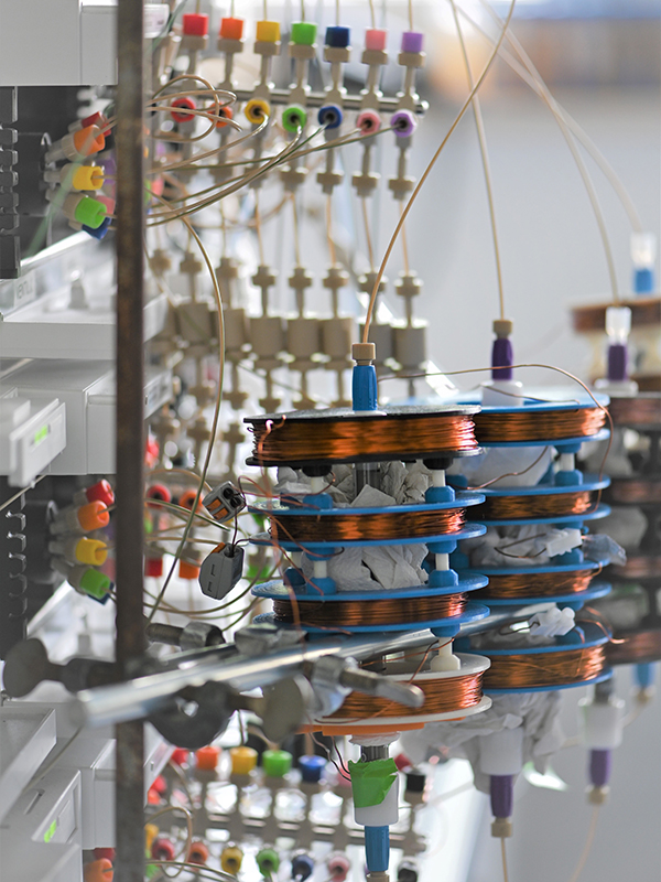 Researchers at the Institute for Functional Interfaces (IFG) at KIT are therefore focusing on precisely this point: they use the principle of magnetic field-controlled chromatography to separate waste mixtures efficiently, in continuous operation, and without the use of aggressive acids. The process is based on the countercurrent principle and works with special separation columns filled with tiny magnetizable beads, e.g., steel balls. While the waste mixture flows through the individual columns in a fluid, magnetic coils positioned along each column generate a targeted magnetic field. The process takes advantage of the fact that the particles react differently to this: some remain stuck between the beads for longer, while others rush through more quickly. They therefore have a longer or shorter “retention time.” As a result, the particles separate spatially and can be continuously extracted as almost pure fractions.